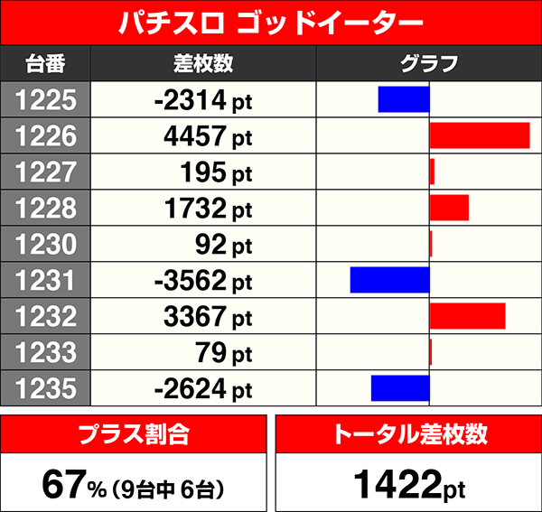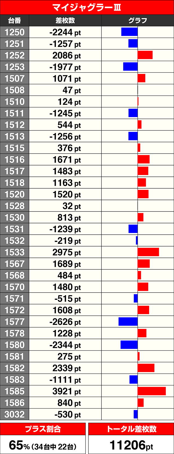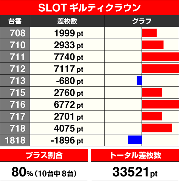 プラスを記録した台はすべて1000ptを上回っており、トータル差枚数は33521ptを記録した。