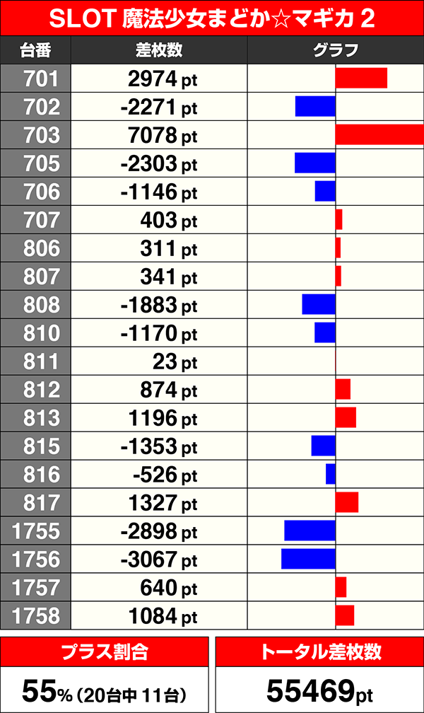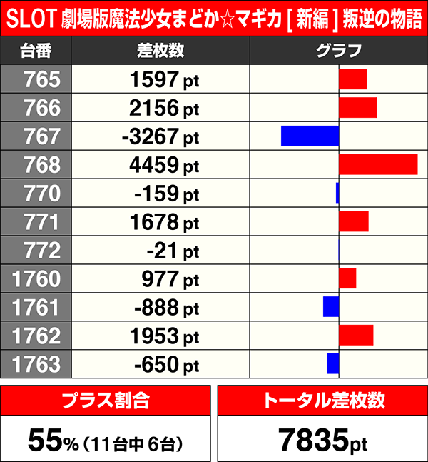 『SLOT劇場版魔法少女まどか☆マギカ[新編]叛逆の物語』と『SLOT魔法少女まどか☆マギカ2』はプラス台数割合が55%。