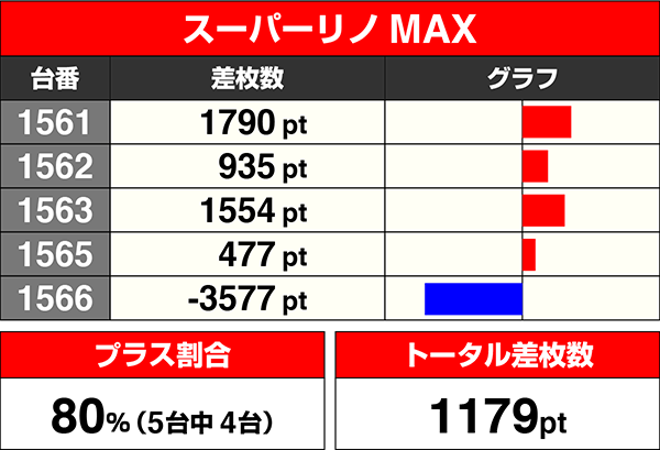 『スーパーリノMAX』や『パチスロ ゴッドイーター』、『戦国乙女2〜深淵に輝く気高き将星〜』も設置台数の半数を超える台の差枚数がプラス。