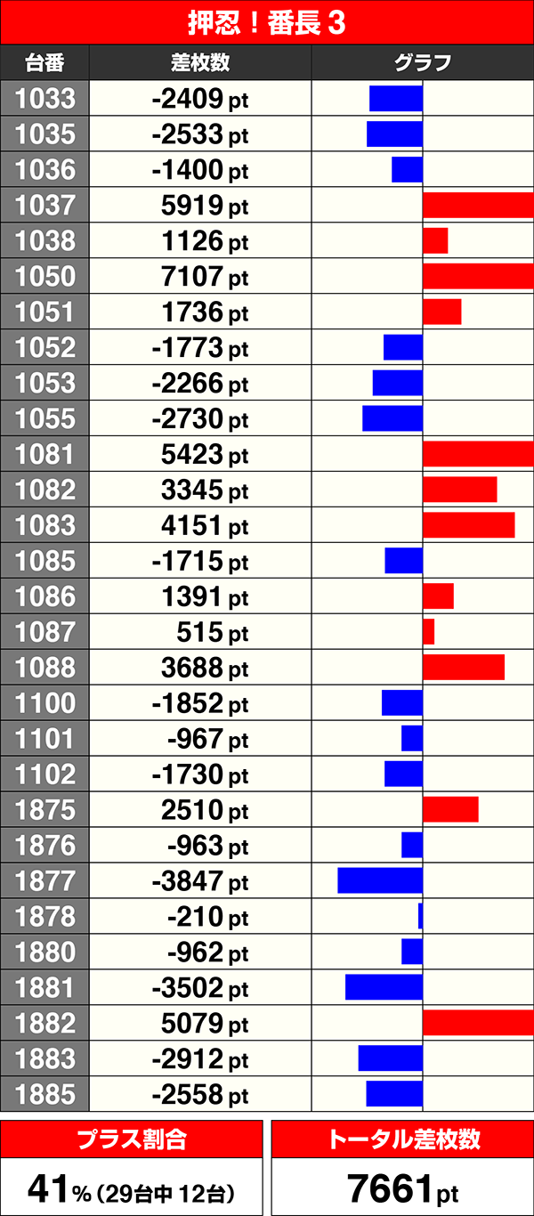 『押忍!番長3』はプラス台数の割合が50%未満ではあったものの、7台が3000ptオーバーとメリハリのある結果となった。