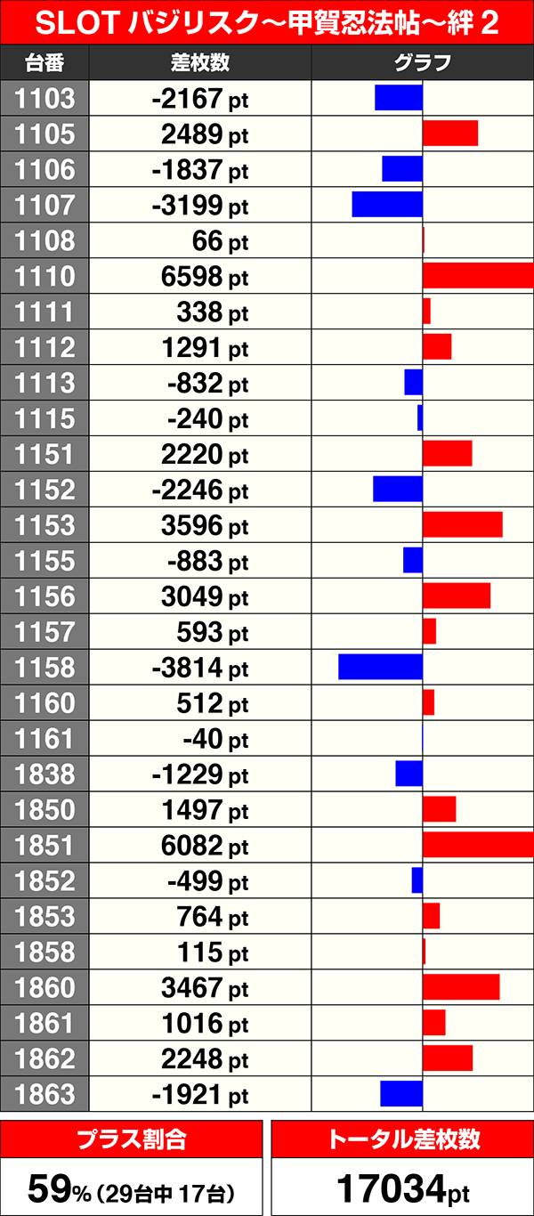 導入から間もない『SLOTバジリスク~甲賀忍法帖~絆2』は29台中17台がプラス。