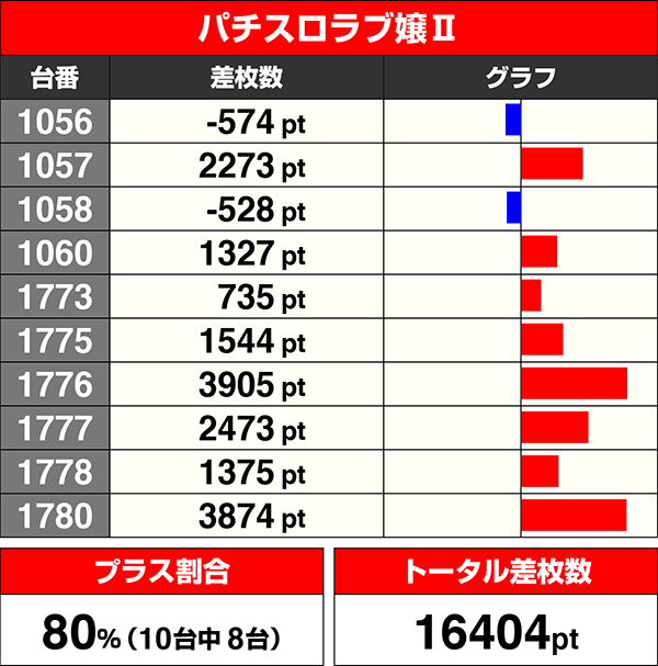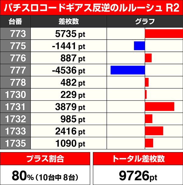 『パチスロコードギアス反逆のルルーシュR2』と『パチスロラブ嬢Ⅱ』はともに10台中8台がプラスであった。
