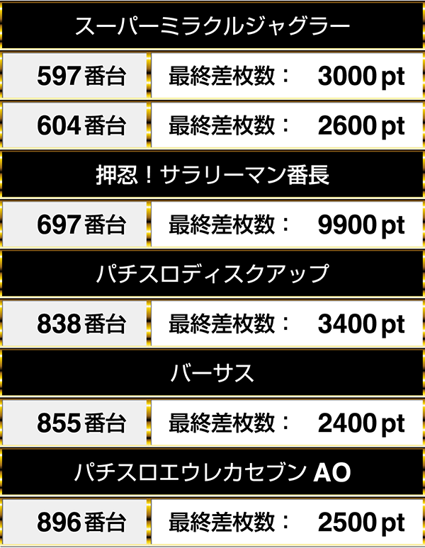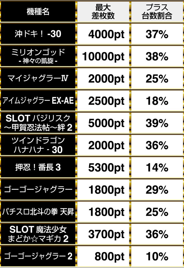 最大差枚数は8機種が2000pt以上であり、そのうちの1機種は10000ptを記録!