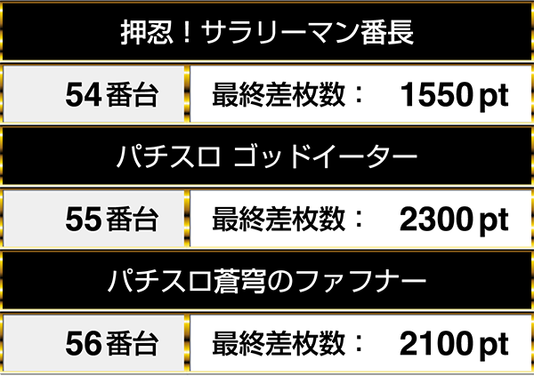 バラエティコーナーでは、54番台の『押忍!サラリーマン番長』から56番台の『パチスロ蒼穹のファフナー』までが連なって1000pt以上を記録!