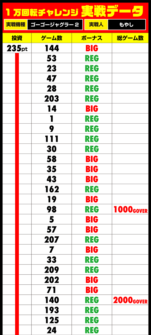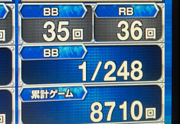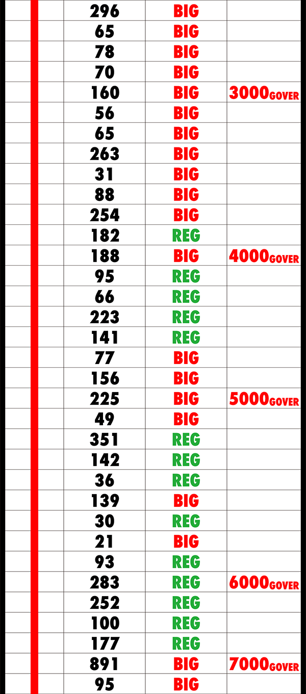 朝イチのタイムロスを埋めるために、午後からは勢いよくレバーを叩いてほしかったのだが…。常連のプレイヤーから声をかけてもらい、交流を楽しんでいる様子。獲得するボーナスがBIGに偏ったせいもあり、消化ペースは上がらず、思うようにゲーム数を伸ばせなかった。