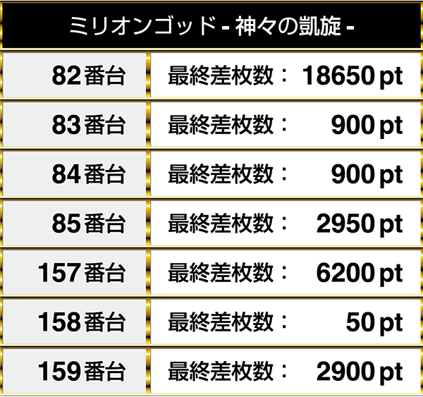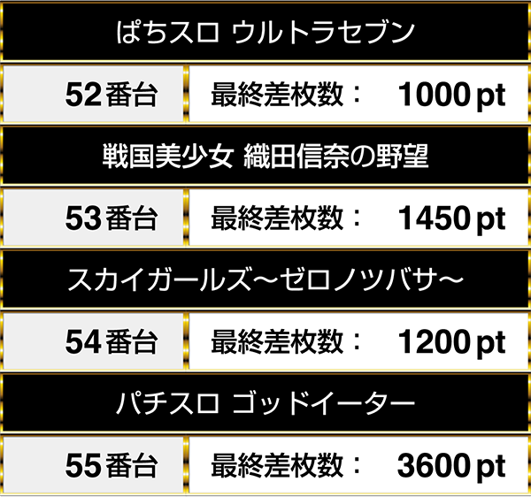 52番台の『ぱちスロ ウルトラセブン』から55番台の『パチスロ ゴッドイーター』までの4台も連なってプラスptを記録し、全台が1000ptを上回った。