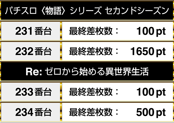 『パチスロ〈物語〉シリーズ セカンドシーズン』と『Re:ゼロから始める異世界生活』は、231番台から234番台までが連なってプラスptを記録した。