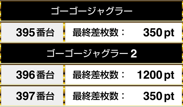 並びで設置された『ゴーゴージャグラー』と『ゴーゴージャグラー2』は3台が連なってプラスpt!