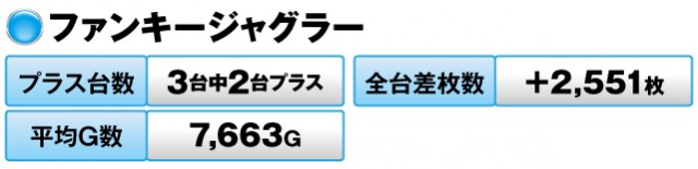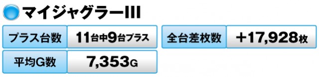 『マイジャグラーⅢ』は11台中9台がプラスで全台差枚数が+17,928枚、『マイジャグラーⅣ』は7台中6台がプラスで全台差枚数は+8,632枚だった。