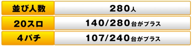パチスロ全体では、280台の半数の140台がプラスで、トータルの差枚数は+128,800枚という素晴らしい結果となった。