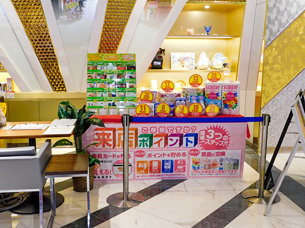 景品コーナーには来店ポイントで交換できるアイテムが用意されており、多くのプレイヤーから視線を集めていた。