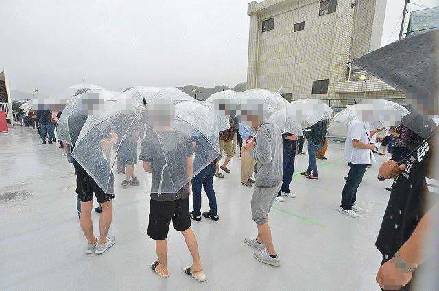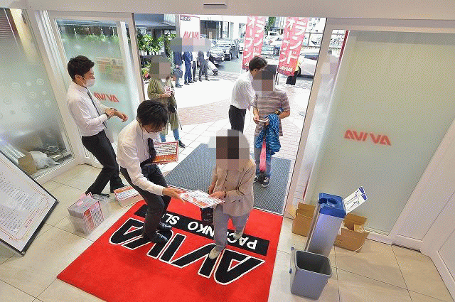 外はあいにくの雨模様。しかし、グランドオープンとくれば絶対に見逃せないお祭りだけに、早朝から多くのパチンコ・パチスロファンが詰めかけていた。