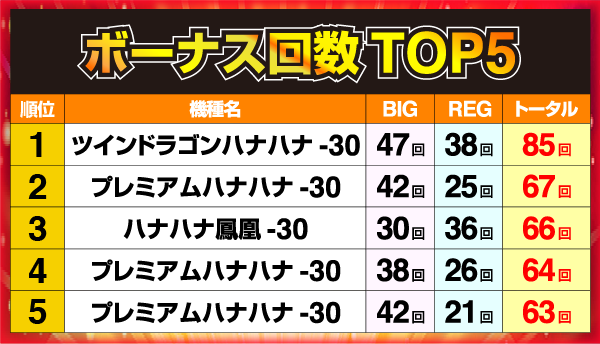 ボーナス回数85回を記録した「ツインドラゴンハナハナ‐30」の1台が、ダントツ!!