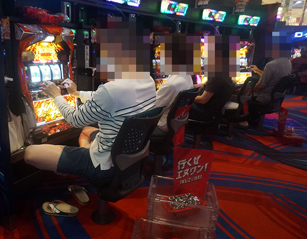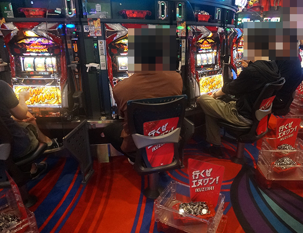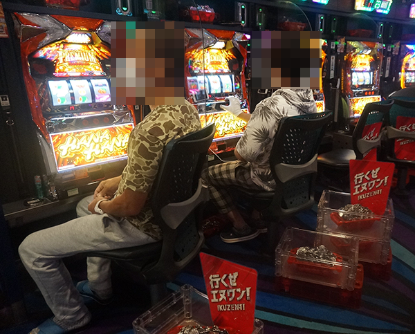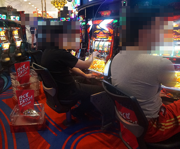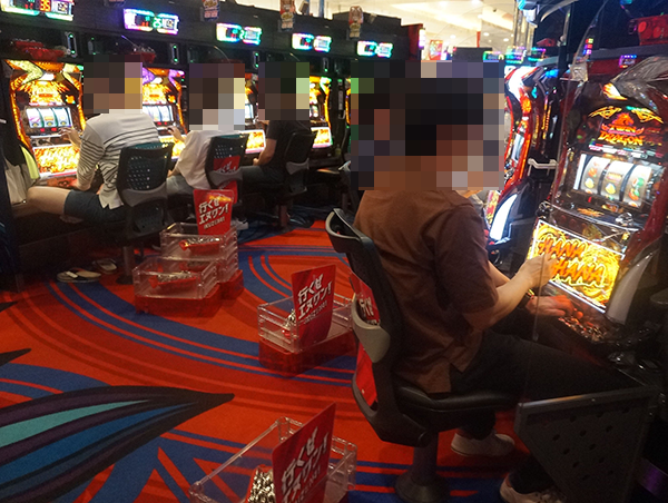 「プレミアムハナハナ‐30」と「ツインドラゴンハナハナ‐30」をはじめ、さまざまな機種が盛況。イキイキと遊技をおこなう姿が並んでいる光景は壮観であった。