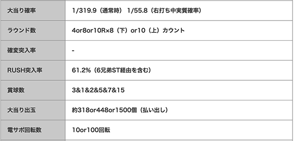 RUSHの継続率は約85%(残り保留含む)で、電チュー経由の大当りは70%が出玉約1500個とウルトラ級の爆発力を誇っている。