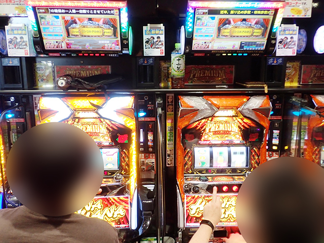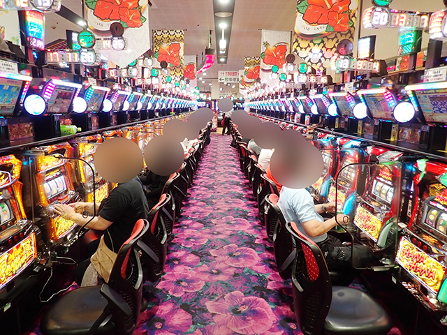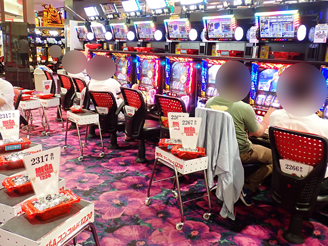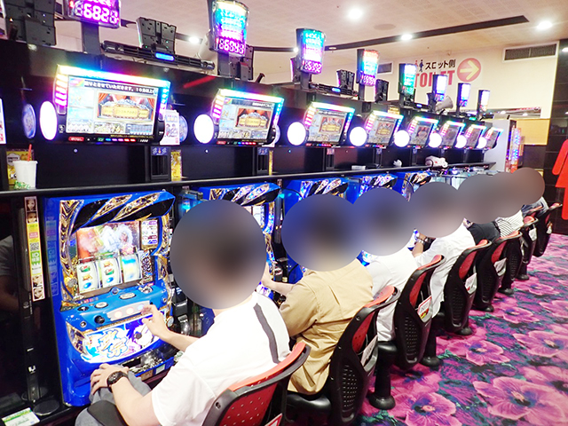 正面出入口でスタッフさんにアルコール除菌をかけてもらい、入場してすぐ目撃したのは、『聖闘士星矢』と『ゴッド凱旋』の後ろ積みラッシュ! 先へ進むと、『ハナハナ』のほかにも『まど2』や『政宗2』の状況がとてもよく、脇目も振らずぶん回すスロッターの姿が印象的な取材だった。