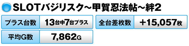 13台中7台がプラスで、全台差枚数は+15,057枚をマーク。