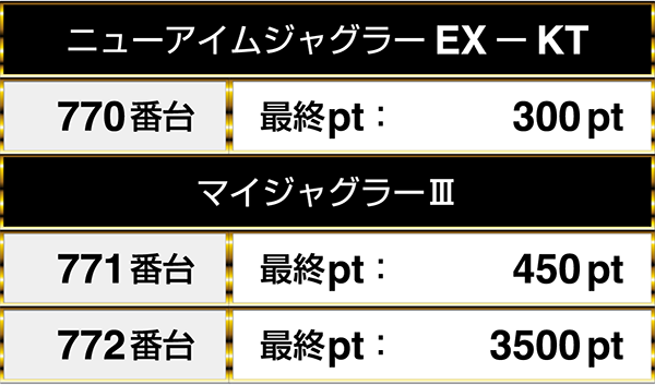 『ニューアイムジャグラーEXーKT』の1台は、『マイジャグラーⅢ』の2台と連なってプラスptとなった。