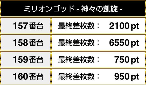『ミリオンゴッド-神々の凱旋-』も6000pt以上の台を含め、4台が連なってプラスpt!!