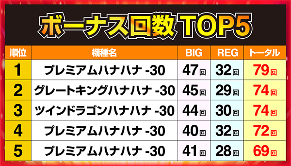 「プレミアムハナハナ‐30」からは3台がTOP5入りをはたし、ボーナス回数79回を記録した1台が第1位!