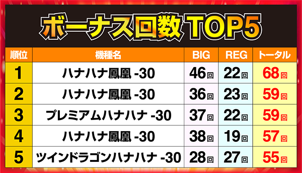 3位の「プレミアムハナハナ‐30」と5位の「ツインドラゴンハナハナ‐30」も、ボーナス回数は50回を上回った。