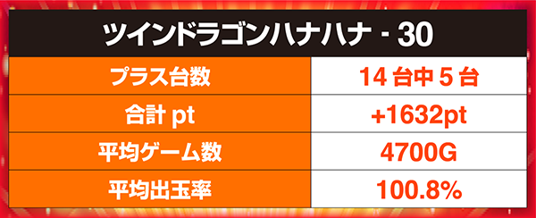 2位から4位にランクインした「ツインドラゴンハナハナ‐30」の3台も、ボーナス回数50回以上であった。
