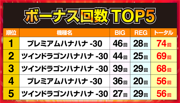 ボーナス回数74回を記録した「プレミアムハナハナ‐30」の1台が堂々の1位に輝き、2位と3位には「ツインドラゴンハナハナ‐30」が並ぶかたちとなった。