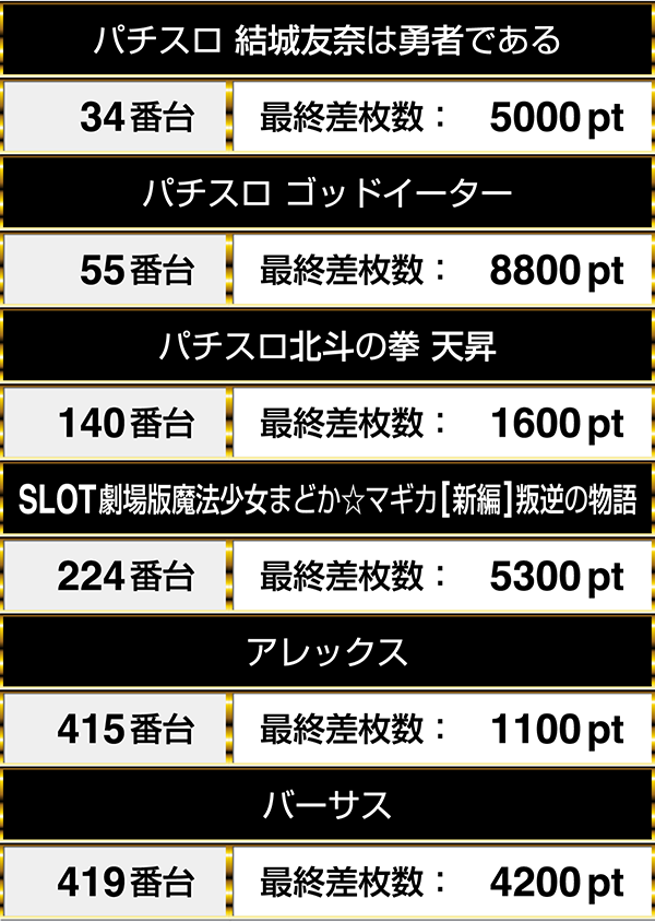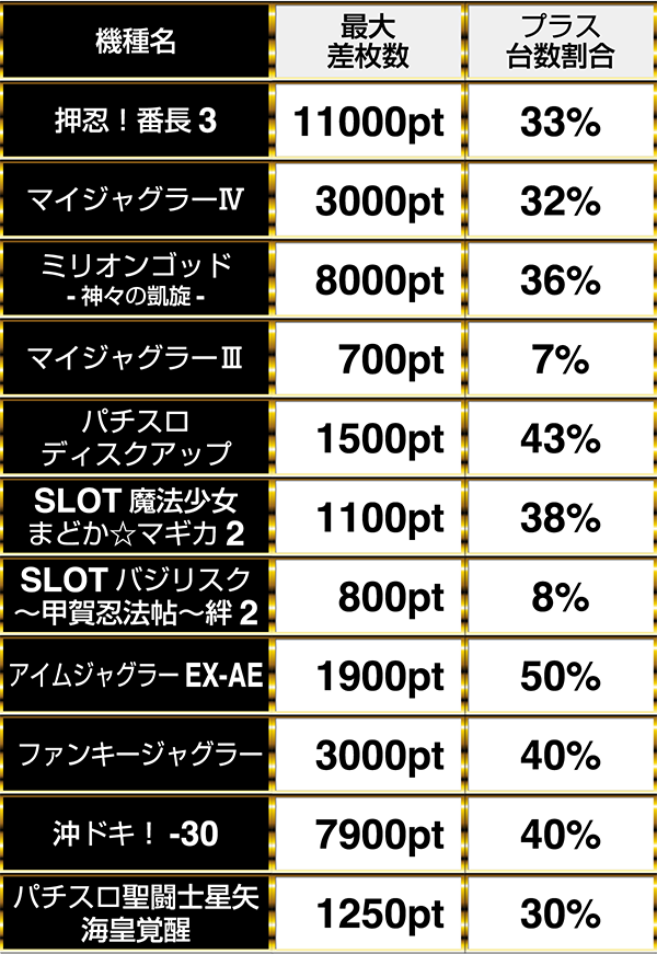 最大差枚数は5機種が2000ptを上回り、1機種には11000ptを記録する台があった。