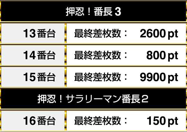 並びで設置された『押忍!番長3』と『押忍!サラリーマン番長2』は、9900ptを含めて4台が連なってプラスptとなった。