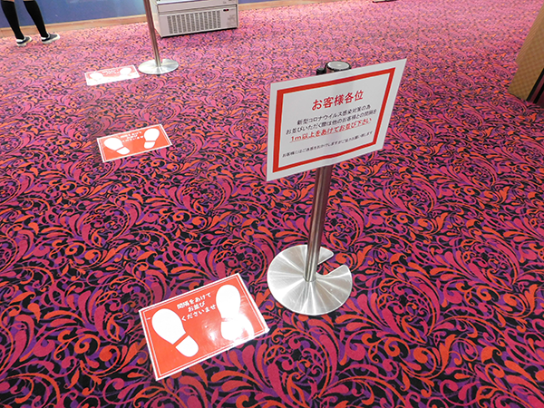カウンターの前には、列の間隔があくように足跡の目印が貼られていた。ソーシャルディスタンスをうながす看板も設置されているなど、プレイヤー同士が密集しないための環境づくりもバッチリだ。
