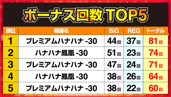 頂点に立った「プレミアムハナハナ‐30」の1台は、ボーナス回数81回と飛び抜けた記録を残した。
