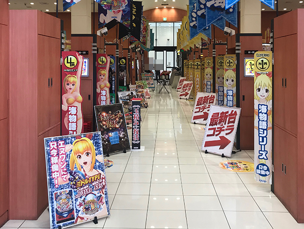 シマの入り口には最新台の看板などが置かれているので、お目当ての機種がどこにあるのかわかりやすいですね!