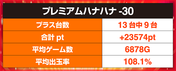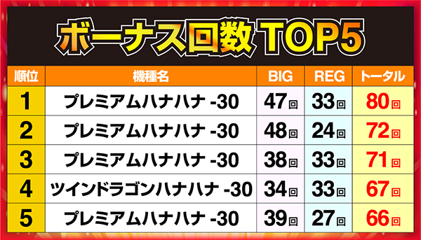 ボーナス回数80回を記録した「プレミアムハナハナ‐30」の1台がダントツ!!