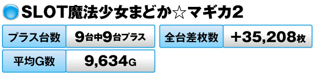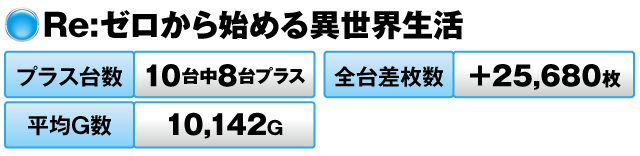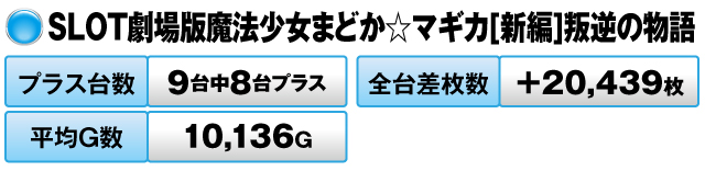 10台中8台がプラスで全台差枚数は+25,680枚、平均G数は『まどマギ2』をも凌ぐ10,142Gにも達した。