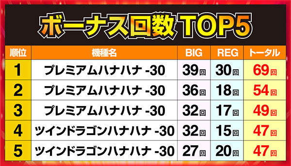 ボーナス回数69回を記録した「プレミアムハナハナ‐30」の1台が首位を獲得した。