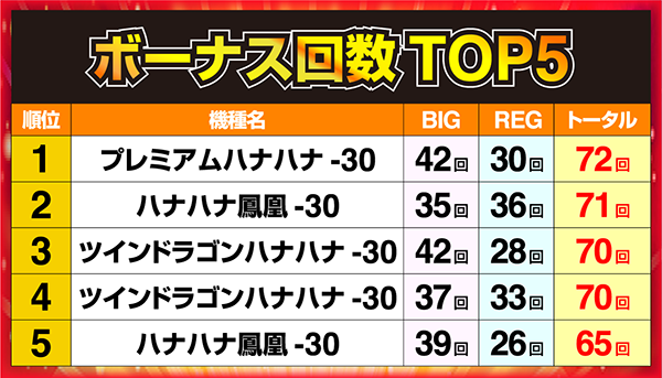 4機種中3機種がTOP5に入っており、ハナハナシリーズ全体が盛り上がっていたこともうかがえるランキングとなった。