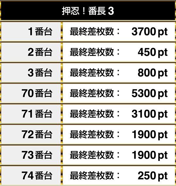 最終的には1番台から3番台、70番台から74番台の2箇所にプラスptが並び、そのうちの3台は3000ptオーバー!!