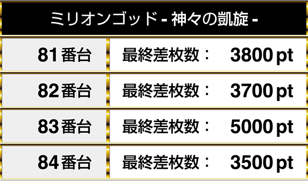 『ミリオンゴッド-神々の凱旋-』は4台が連なってプラスptを記録し、全台が3000ptを上回った。