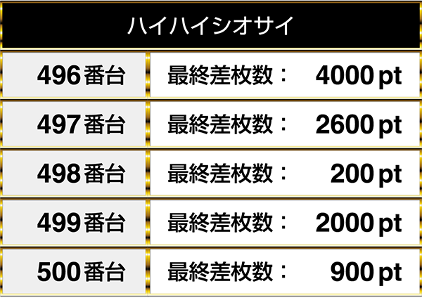 ほぼ満席であった『ハイハイシオサイ』は設置されている5台すべてがプラスptとなり、1台が4000pt!!