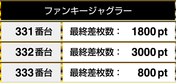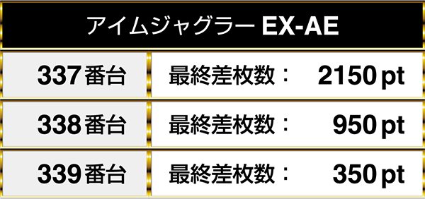 最終的には『ファンキージャグラー』と『アイムジャグラーEX-AE』の3台が連なってプラスptを記録した。