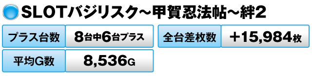 8台中6台がプラスで全台差枚数が+15,984枚、平均G数は8,536Gを記録している。