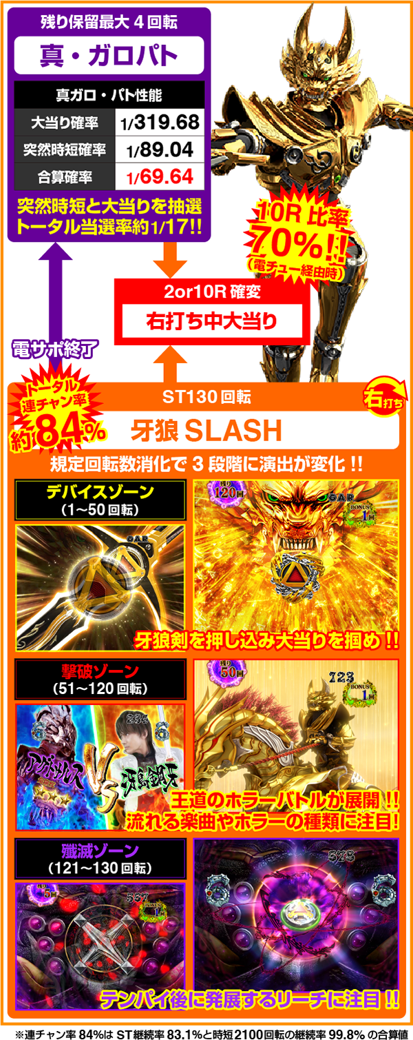 ST130回転の連チャン率は約83%で、残り保留(突然時短+遊タイム経由を含む)での引き戻しをあわせたトータルの継続率は約84%となっている。