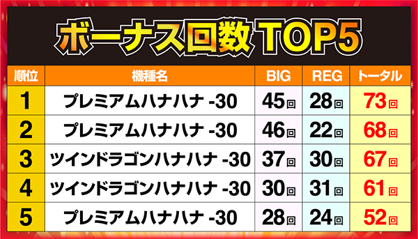 ボーナス回数73回を記録した「プレミアムハナハナ‐30」の1台が首位獲得!!