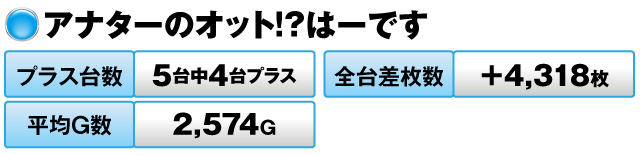 5台中4台がプラスで全台差枚数は+16,181枚を記録した。