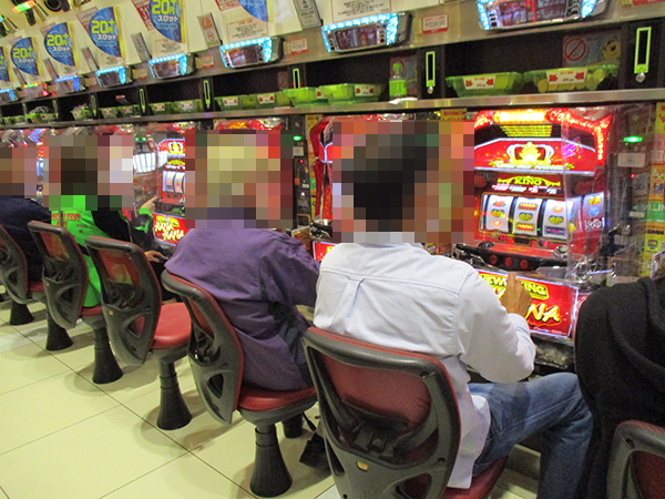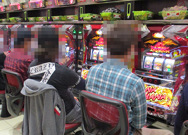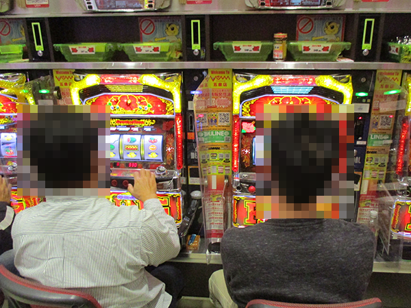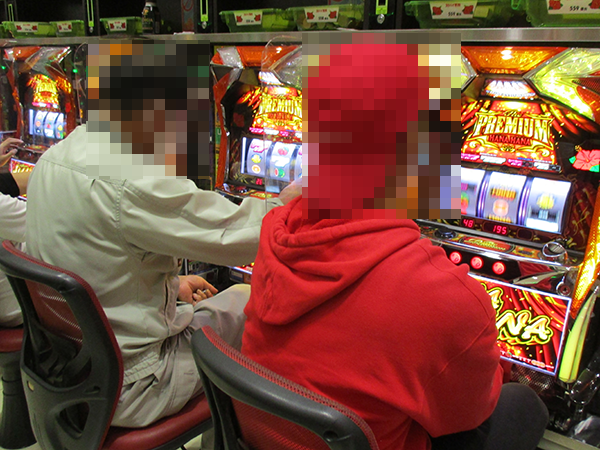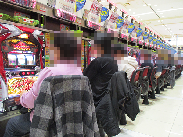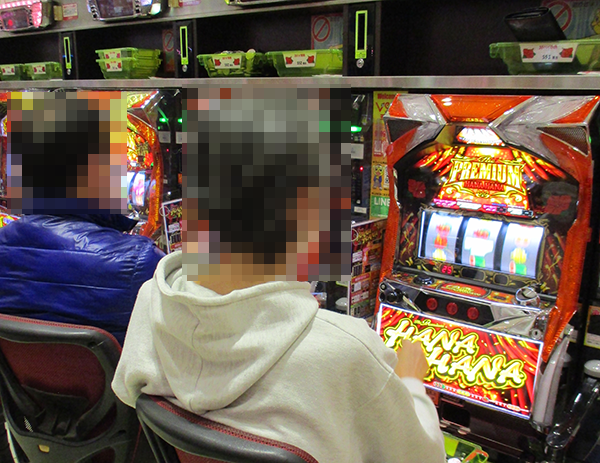 「プレミアムハナハナ-30」も10台のうち9台が埋まるほどに人気。楽しそうに遊技をおこなっている姿が並び、にぎやかな状況となっていた。