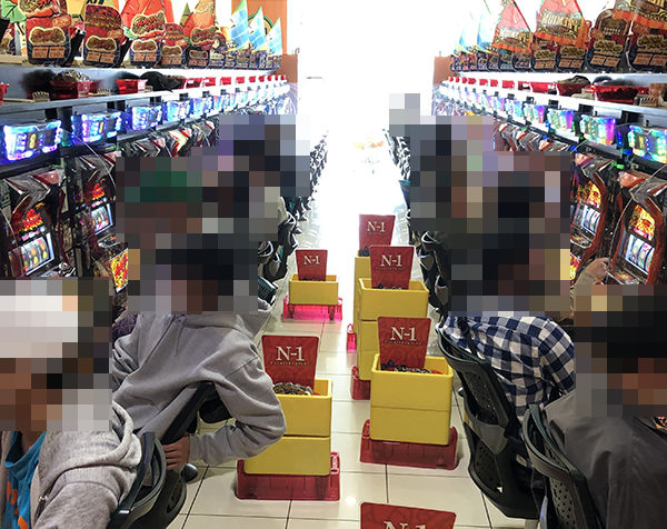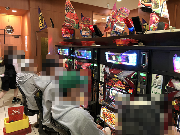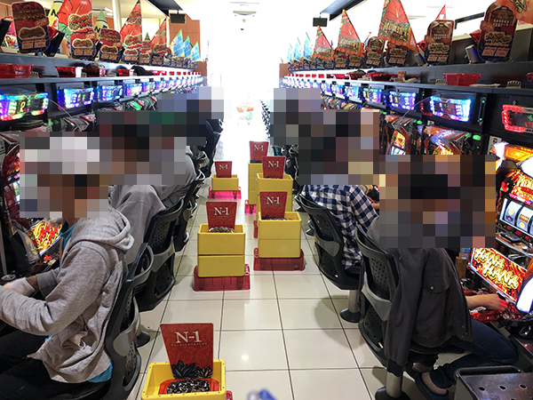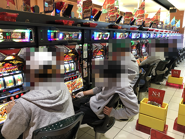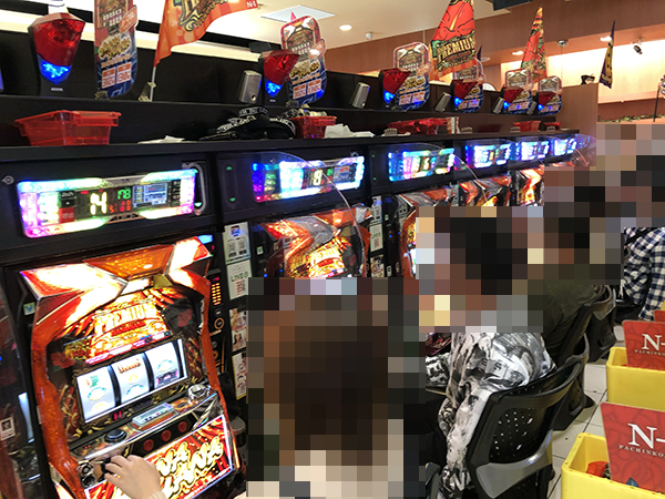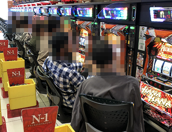 7台全台が稼働するほどに人気を集めていた「プレミアムハナハナ‐30」でも、プレイヤーたちが活躍。イキイキとストップボタンを押す姿が並んでいる光景は壮観だ。