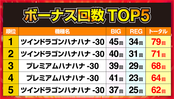 1位と2位にランクインした「ツインドラゴンハナハナ‐30」はどちらもボーナス回数70回オーバー!