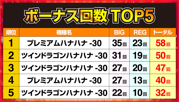 1位と2位のボーナス回数は50回以上となっており、頂点に立ったのは58回を記録した「プレミアムハナハナ‐30」の1台であった。