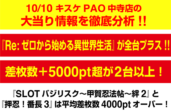 10月10日、キスケグループイメージキャラクターのキスケンが特徴的なエリアPUSHも配信された「キスケPAO中寺店」を日刊ぱちタウンでピックアップ。
