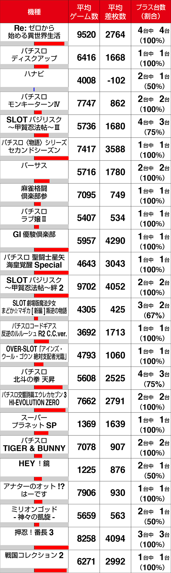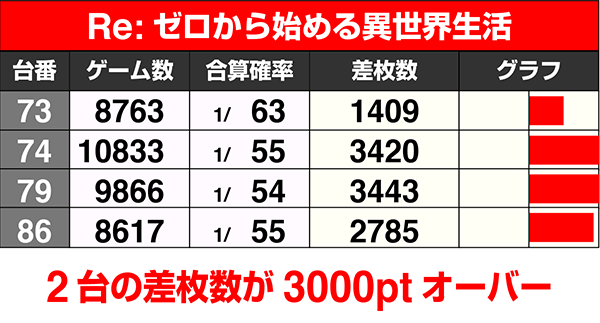 『Re:ゼロから始める異世界生活』は4台がともに8000G以上楽しまれており、2台が差枚数+3000ptオーバー。